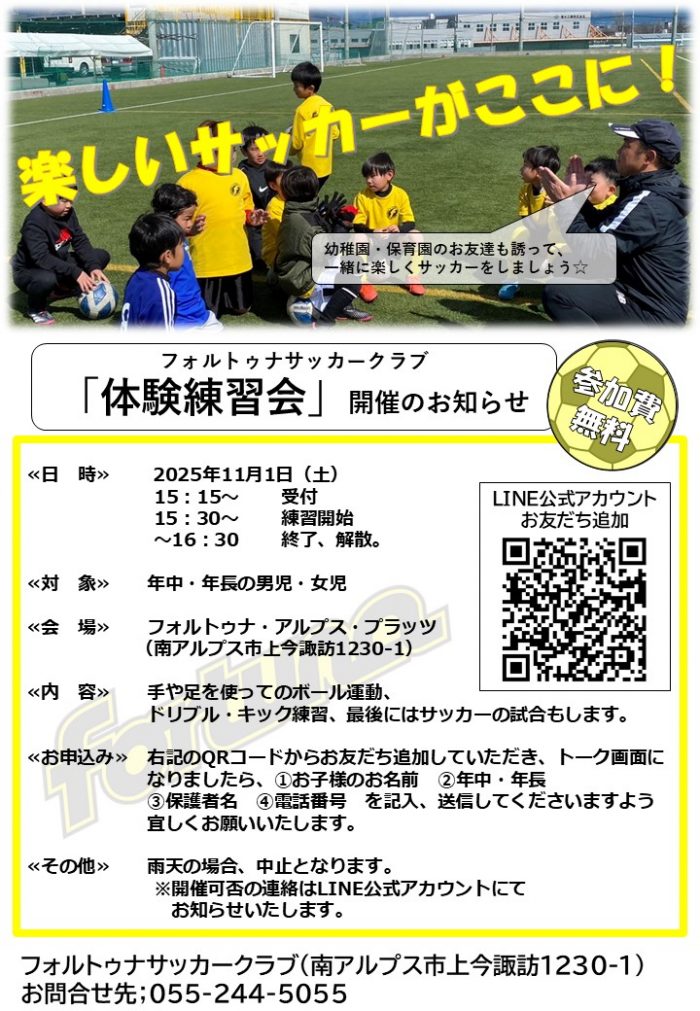 フォルトゥナサッカークラブでは、11月1日(土)に「体験練習会」を開催いたします。