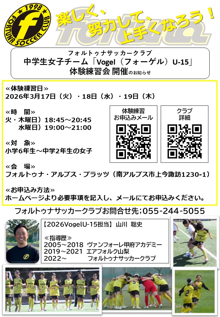 フォルトゥナサッカークラブVogel(フォーゲル)U-15では、体験練習会を開催いたします。